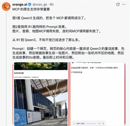 一些业内人士已经迫不及待地用Qwen3构建应用了。火星电波创始人、前MiniMax海螺AI产品负责人冯雷创建了一个网页,成功地调用了图片、音频、地图等各个MCP,很快就实现了提示词的效果。他在其个人社交平台上也分享了这一成果,并表示“MCP的原生支持非常重要”。